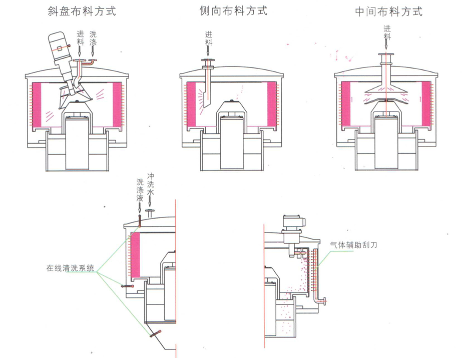 4.布料方式選擇:a斜盤布料方式,布料及洗滌更加均勻合理, 避免因布料不均引起震動。b進料管進料(可設置分層進料),水洗管洗滌。