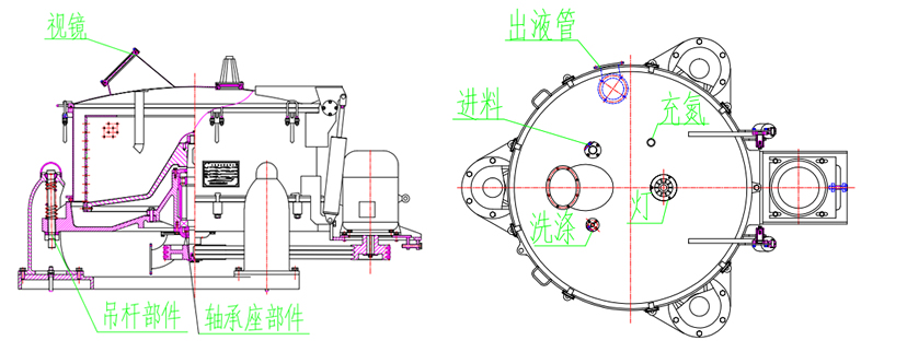 3.大翻蓋設計,平衡缸助力,開蓋輕便省力。上蓋設置,進料、水洗、視鏡、防爆燈、充氮口。